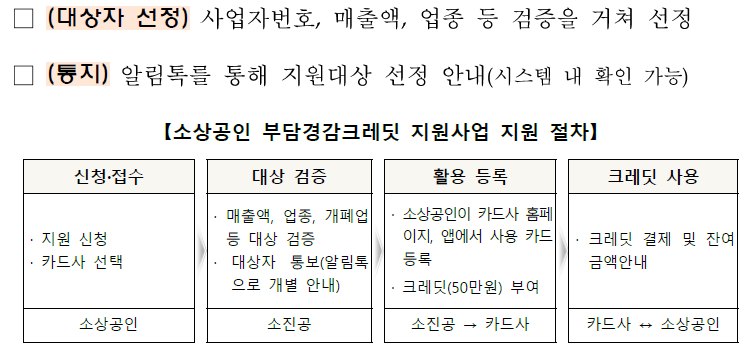 소상공인 1인당 크레딧 50만원을 등록한 카드로 지급