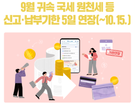 국세청은 10월 초 장기 연휴(10.3.~ 10.9.)에 따른 납세자 불편을 해소하고자 9월 귀속 국세 관련 신고·납부·제출 등의 기한을 10.10.(금)에서 10.15.(수)으로 5일간 연장하기로 하였습니다.
